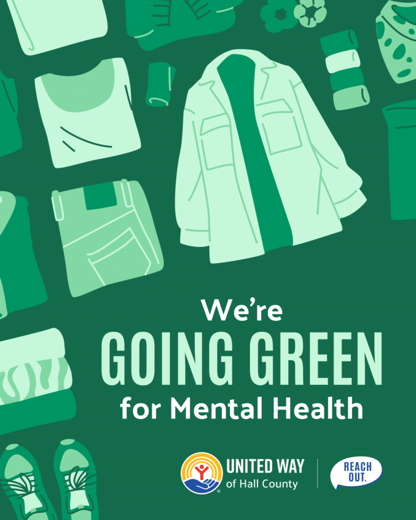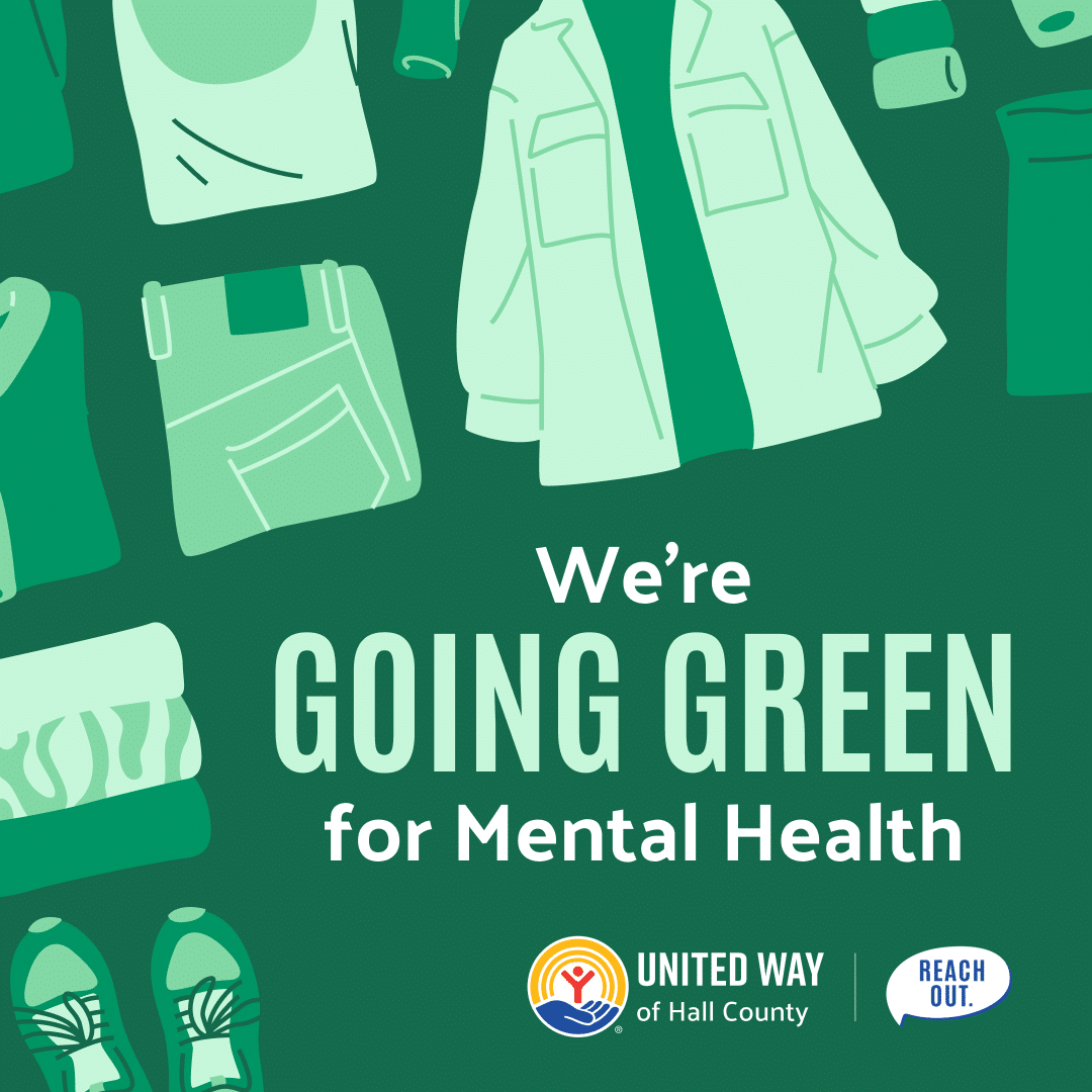 Show your support for mental health by wearing green clothing or ribbons on Wednesday, May 20, 2026. On that same day, join United Way of Hall County’s One Hall Health Committee to walk for mental health awareness. The group will meet at First Baptist Church and walk down Green Street and back. If you or your business are interested in learning more about how to join the Hall Goes Green efforts, please contact us.